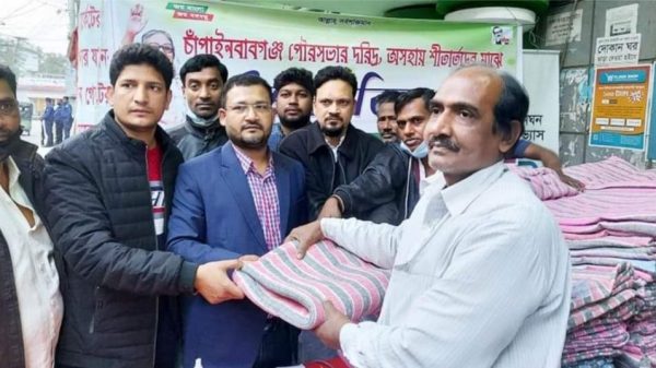 চাঁপাইনবাবগঞ্জে মেয়র পদপ্রার্থী মোখলেসুরের কম্বল বিতরণ।